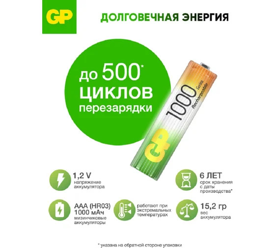 Аккумуляторы GP выдерживают до 500 циклов перезарядки. В отличие от обычных одноразовых элементов питания, которые постепенно теряют напряжение и ухудшают свою работу, эти аккумуляторы держат рабочее напряжение до последнего.