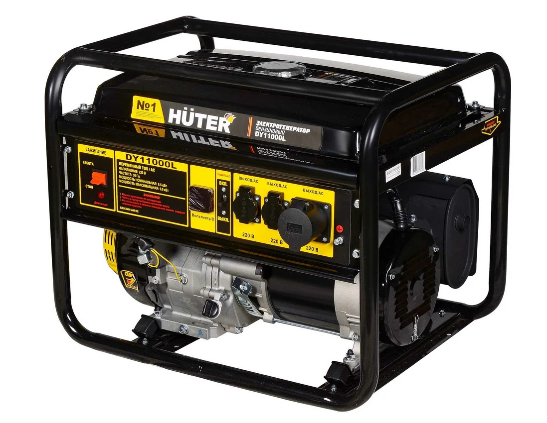 Модель электрогенератора HUTER DY11000L является отличным вариантом альтернативного источника питания, который можно использовать в местах, где отсутствует магистральное электроснабжение или имеют место частые его перебои. Генератор оснащён 4-тактным одноцилиндровым бензиновым двигателем с воздушным охлаждением мощностью 19л.с. Он работает на неэтилированном бензине АИ92. Расход топлива – 375г/кВтч. Ёмкость топливного бака составляет 25л, системы смазки – 1100мл.