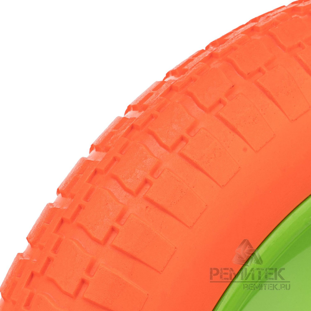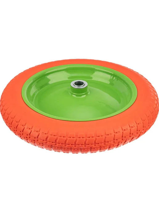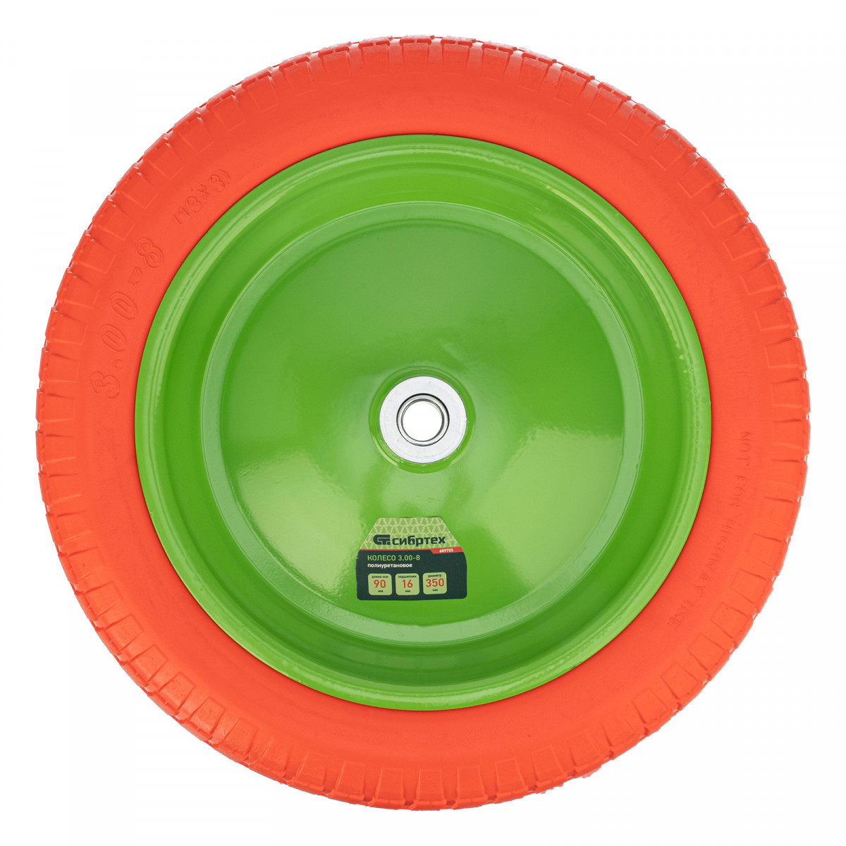 Полиуретановое колесо 3.00-8 Сибртех 689755 с длиной оси 90 мм и диаметром подшипника 16 мм — движущий элемент тачек Palisad 689123, 689125, 689223, 689153, Сибртех 689615 и др. Непрокалываемое колесо подходит для использования в самых жестких условиях. В отличие от пневматических колес не требует подкачки, обслуживания и легко отмывается от грязи. Преимущества: - Плавный ход — колесо с глубоким протектором обладает высокими амортизирующими свойствами. - Прочность — стальной диск имеет сплошной сварной шов по всей окружности, ось надежно фиксируется в ступице благодаря стальным подшипникам. - Высокий ресурс — полиуретановое колесо не разрушается от воздействия влаги, солнечных лучей, бензина и масла, обладает повышенной стойкостью к проколам и выдерживает температуру -50 до + 50 ℃.