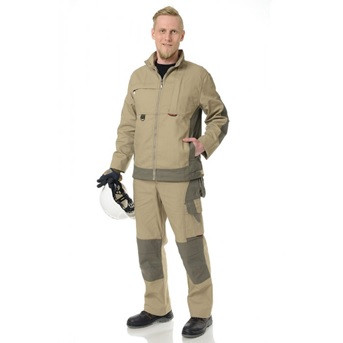 костюм состоит из куртки и брюк. Дополнительно комплектуется футболкой (100% хлопок). Куртка прямого силуэта c удлиненной спинкой. Полочка и спинка с фигурными кокетками и рельефам. Полочка с верхними карманами на молнии, с боковыми карманами. Ширина по низу куртки и рукава регулируется патами с контактной лентой. Рукава двухшовные, с анатомическими накладками. Воротник стойка. Бортовая застежка центральная на молнию. Низ куртки с притачным фигурным поясом. Брюки прямого силуэта с застежкой в среднем шве на молнию, притачной пояс со шлевками. Съемный пояс с пряжкой, съемные навесные трехслойные карманы-портфели.Передние половинки оформлены контрастными наклонными карманами и анатомическими наколенниками. Задние половинки брюк с кокетками, с накладными карманами и клапаном. В области боковых швов накладные карманы для инструментов с дополнительными карманами. Низ брюк усилен вторым слоем отделочной ткани.