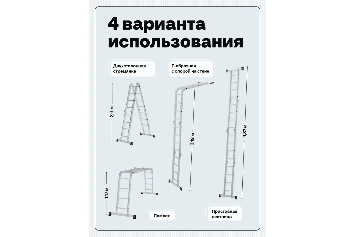 Четырехсекционная лестница-трансформер Новая Высота 4х4 ступени отлично подойдёт для ремонтных работ. Многофункциональность. Лестница легко преобразуется в помост, стремянку, приставную лестницу, приставную согнутую лестницу. Качество. Модель оснащена стойками с дополнительным усилением в наиболее нагруженных местах для повышения жесткости. Удобство. Шарнирные замки регулируются одной рукой. Долговечность. Благодаря многократной развальцовке в соединении ступеней со стойками изделие имеет долгий срок службы.