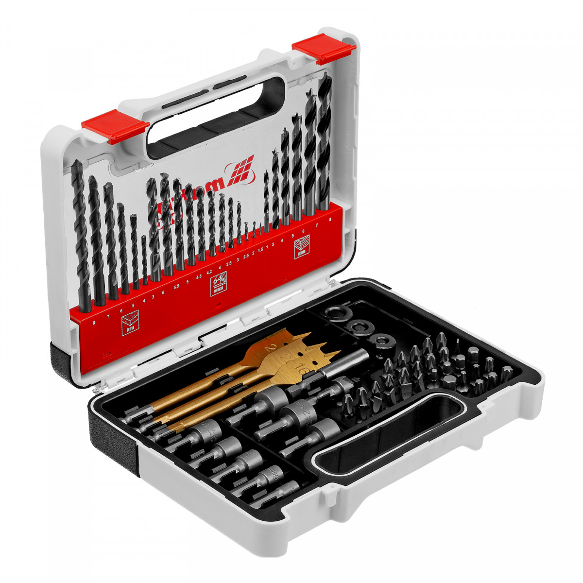• Прочность и долговечность — биты, торцевые головки и адаптер выполнены из хромованадиевой стали, сверла по металлу из стали Р6М5, а сверла по дереву — из стали 45.