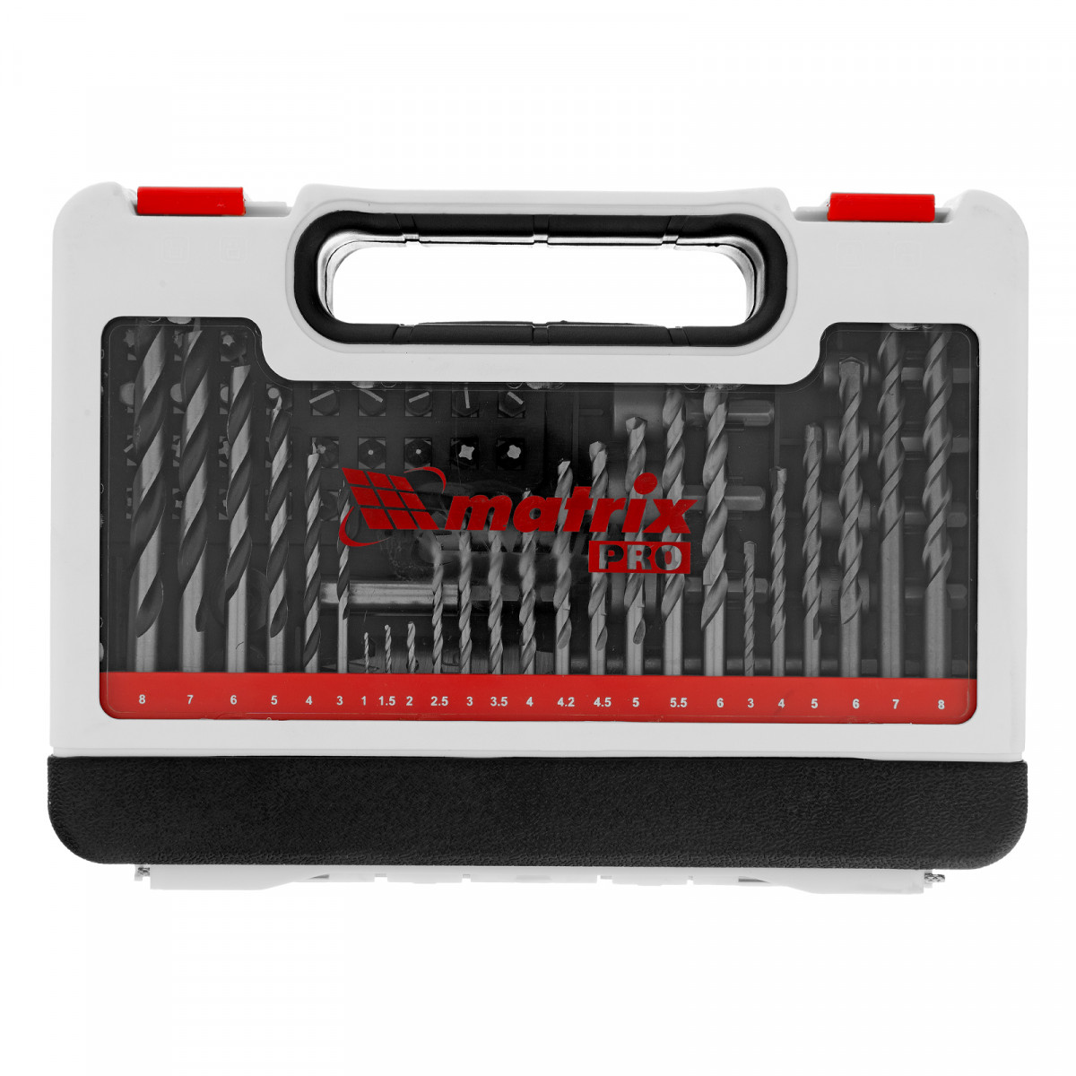 Комбинированный набор Matrix PRO 725671 — универсальное решение для мастеров, т. к. он содержит 71 предмет: отверточные биты (30 шт.) и адаптер к ним, шестигранный ключ, зенковку, стопорные кольца, 8 торцевых головок, 3 перовых сверла, сверла по дереву 3-8 мм, сверла по бетону 3-8 мм и сверла по металлу 1-6 мм. Оснастка подходит как для бытового использования, так и решения профессиональных задач.