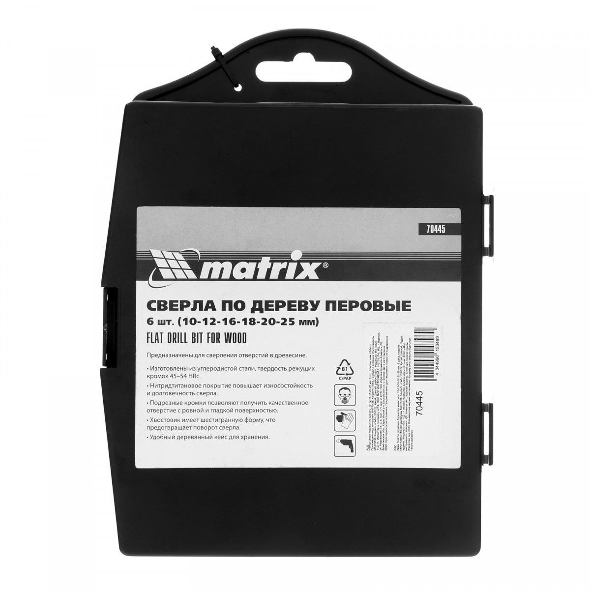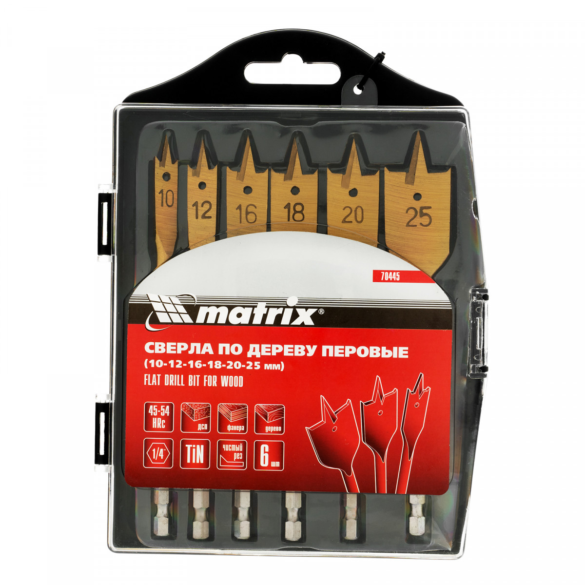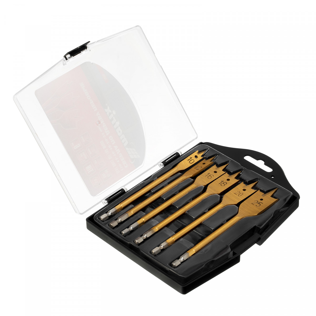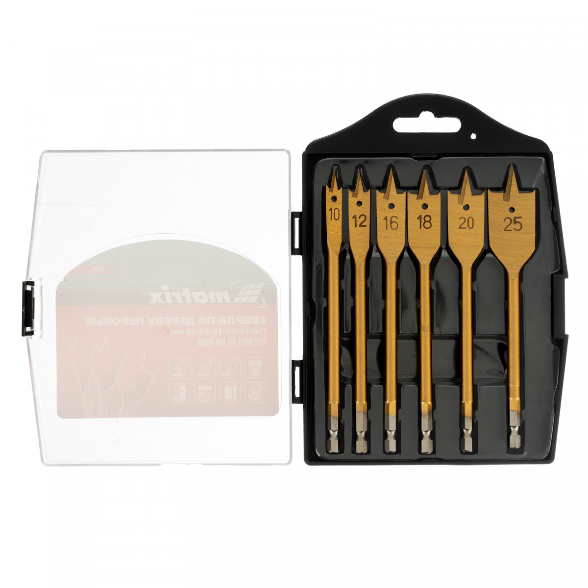 Набор сверл перовых по дереву, 10-12-16-18-20-25 мм, 6 шт, пластиковый кейс, Matrix