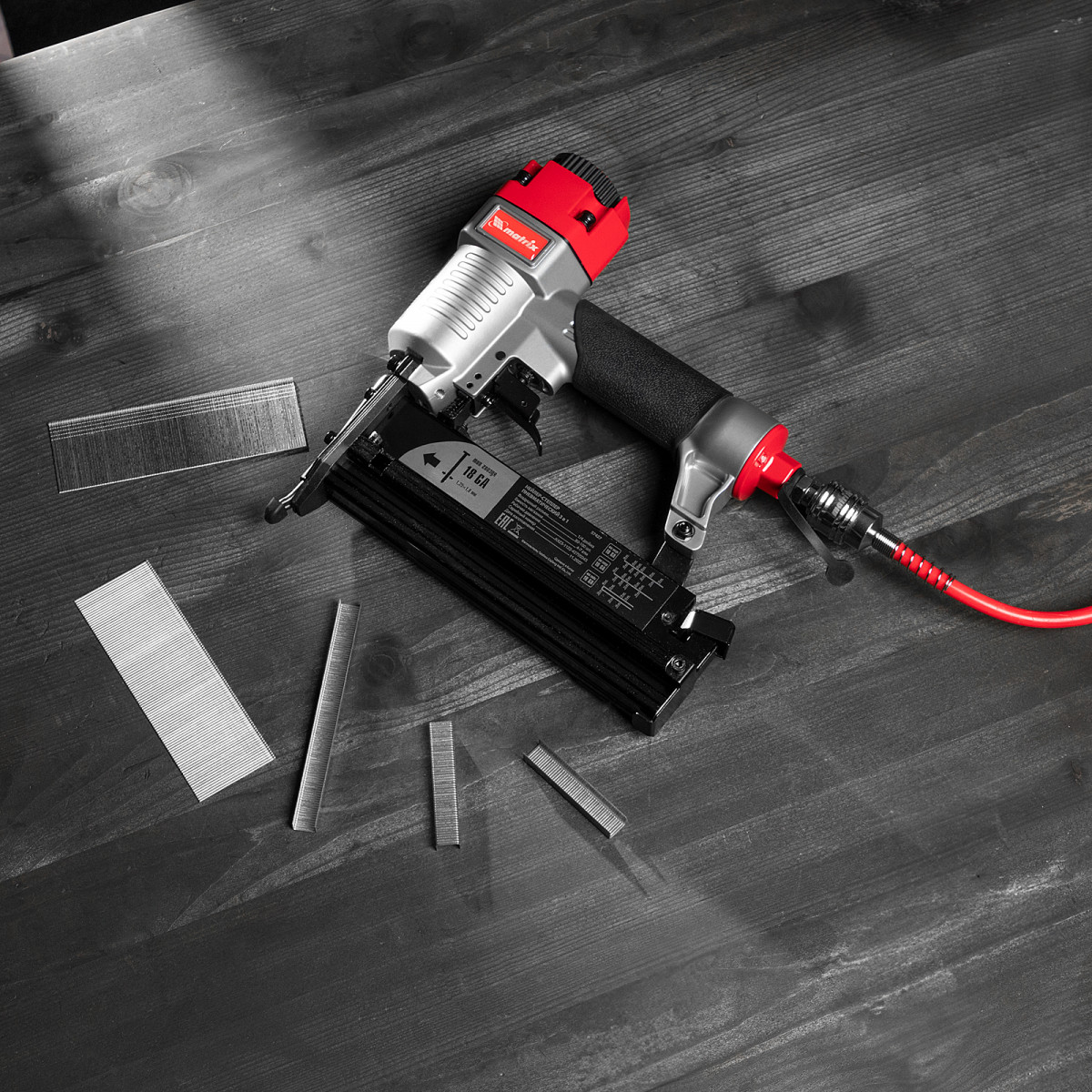 Пневматический нейлер-степлер 3 в 1 Matrix 57427 способен забивать на регулируемую глубину скобы 18 GA и гвозди 18GA и 16GA. Используется для фиксации паркетной доски, фанеры, ДВП, шифера, гипсокартона, ткани и бумаги. Пригодится во время ремонта, а также для сборки мебели и отделочных работ. Расход воздуха составляет 107 л/мин, поэтому нейлер-степлер можно подключать к любому типу компрессоров.