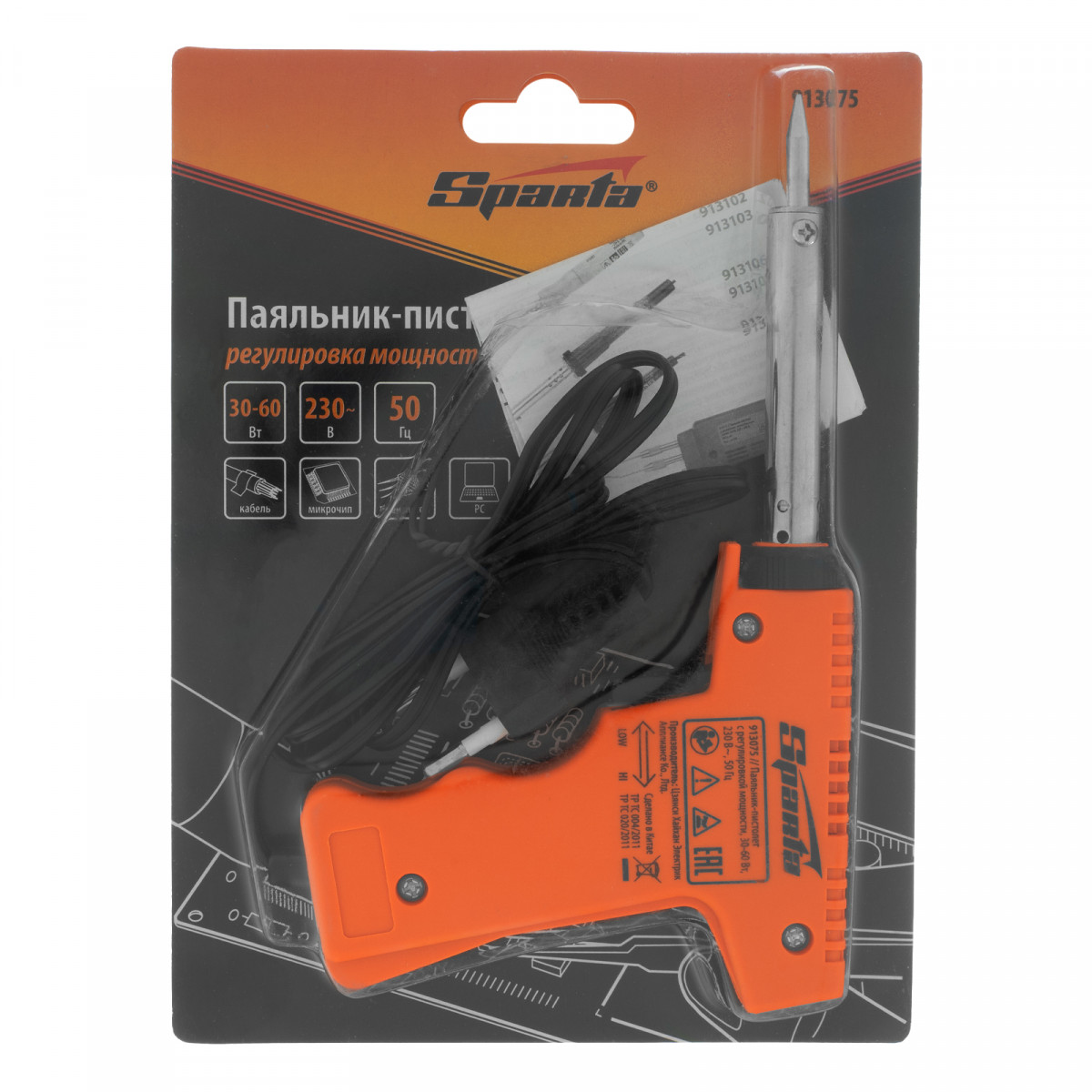 Паяльник-пистолет с регулировкой мощности 30-60 Вт, 220 В Sparta