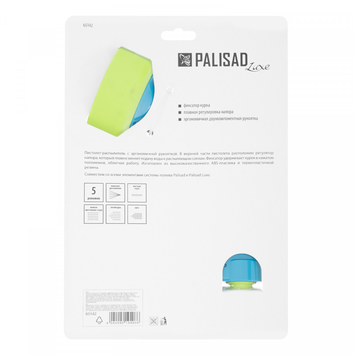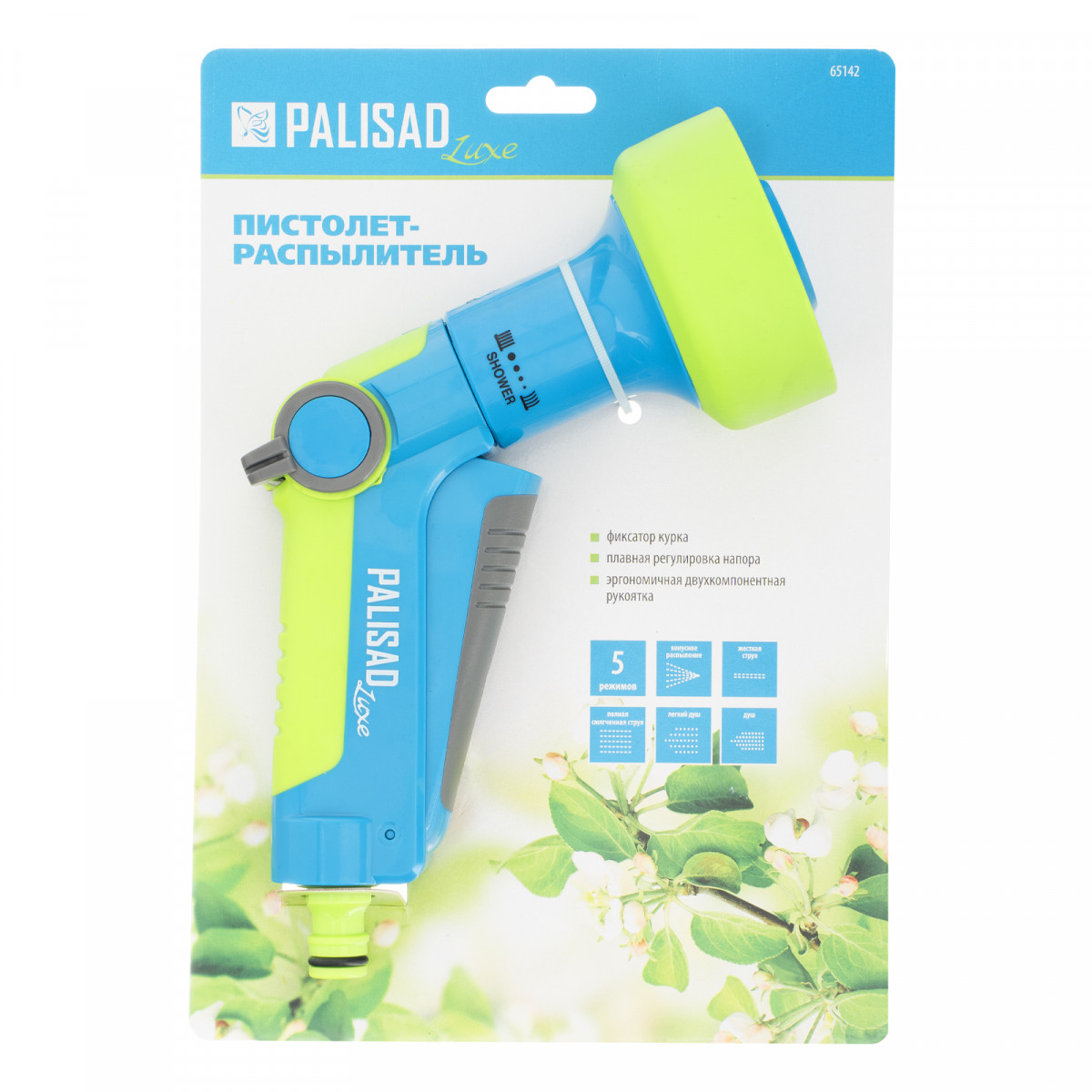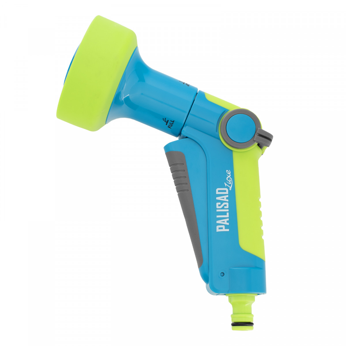 Пистолет-распылитель Palisad Luxe 65142 с 5 режимами и плавным регулятором напора устанавливается в качестве насадки на шланг и совместим с любыми системами полива ТМ Palisad. Благодаря ему можно быстро полить огород, сад, газон, очистить дорожки и рабочий инвентарь. Простая, но надежная конструкция пистолета позволяет использовать его для решения бытовых и профессиональных задач.
