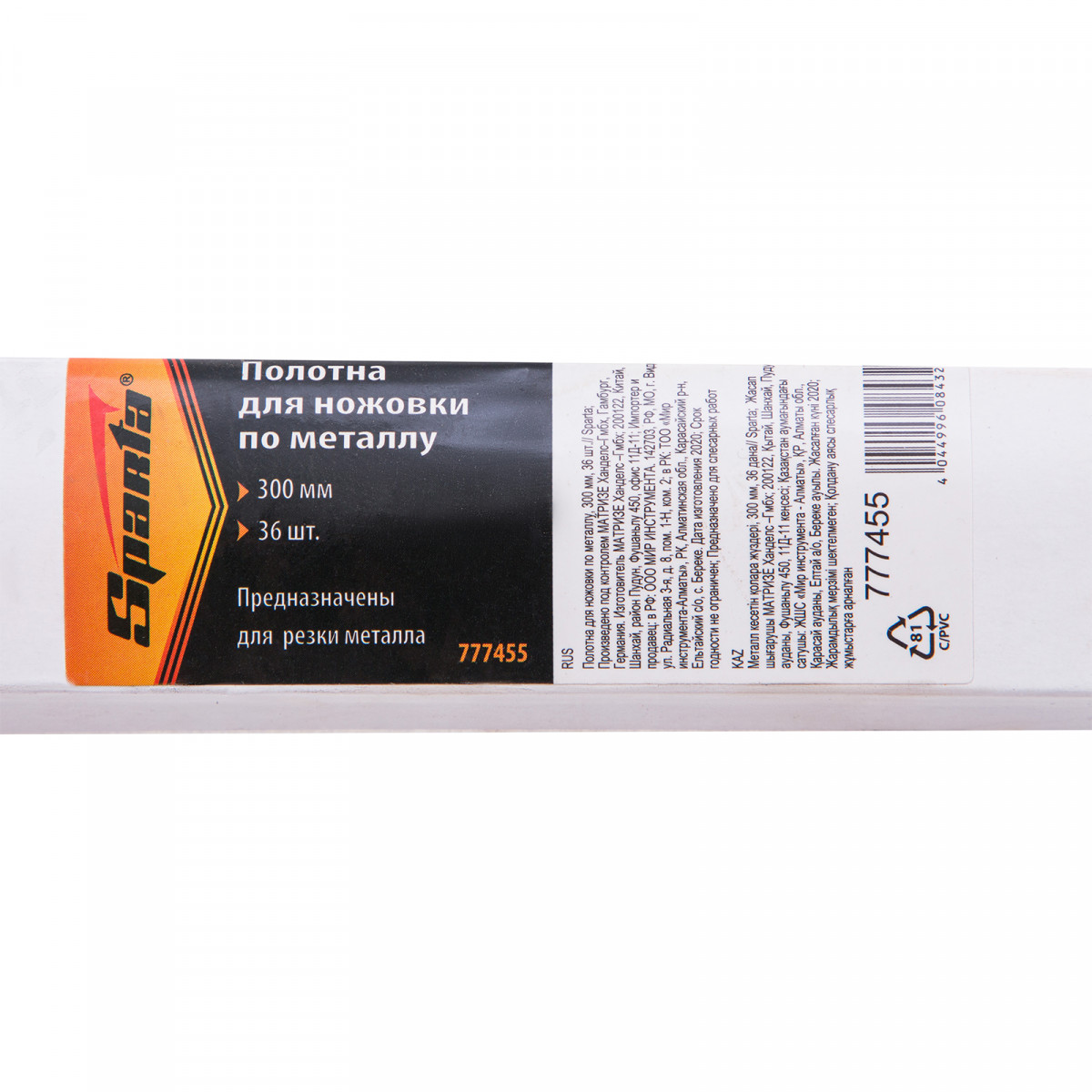 Полотна Sparta 777455 длиной 300 мм, 36 шт., устанавливаются на ручные ножовки по металлу. С их помощью можно осуществлять резание металлопрофиля и различных заготовок, в том числе из цветных металлов. Полотна рассчитаны на несложные слесарные и монтажные работы в гараже, доме, мастерской.