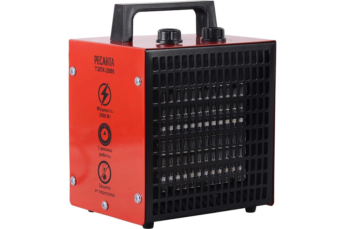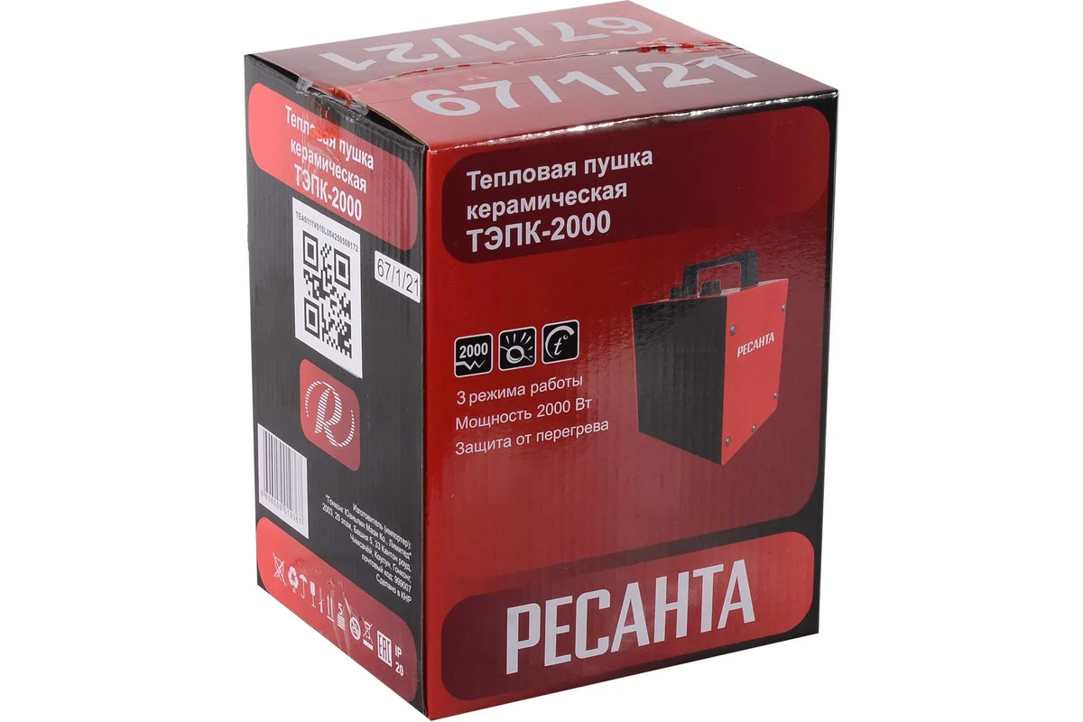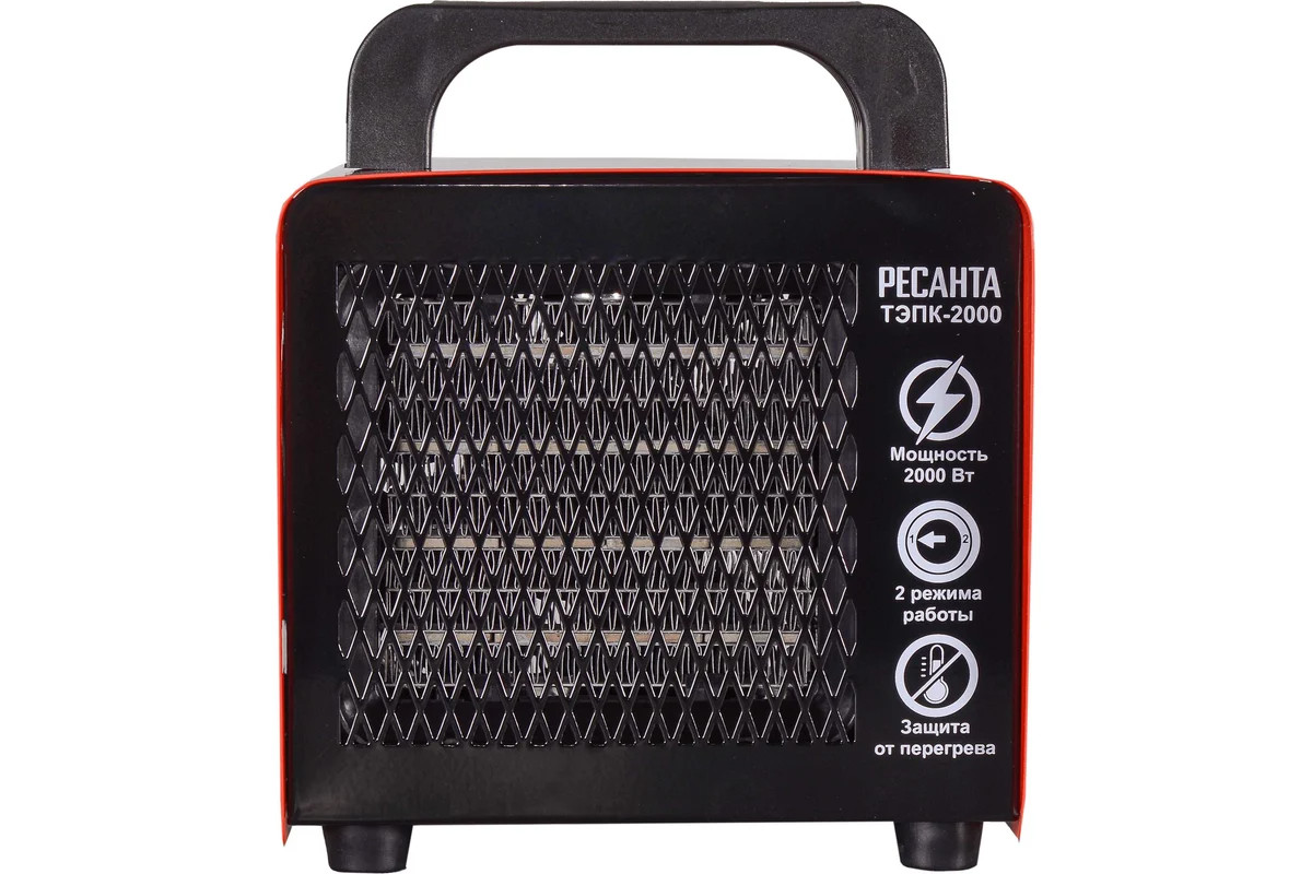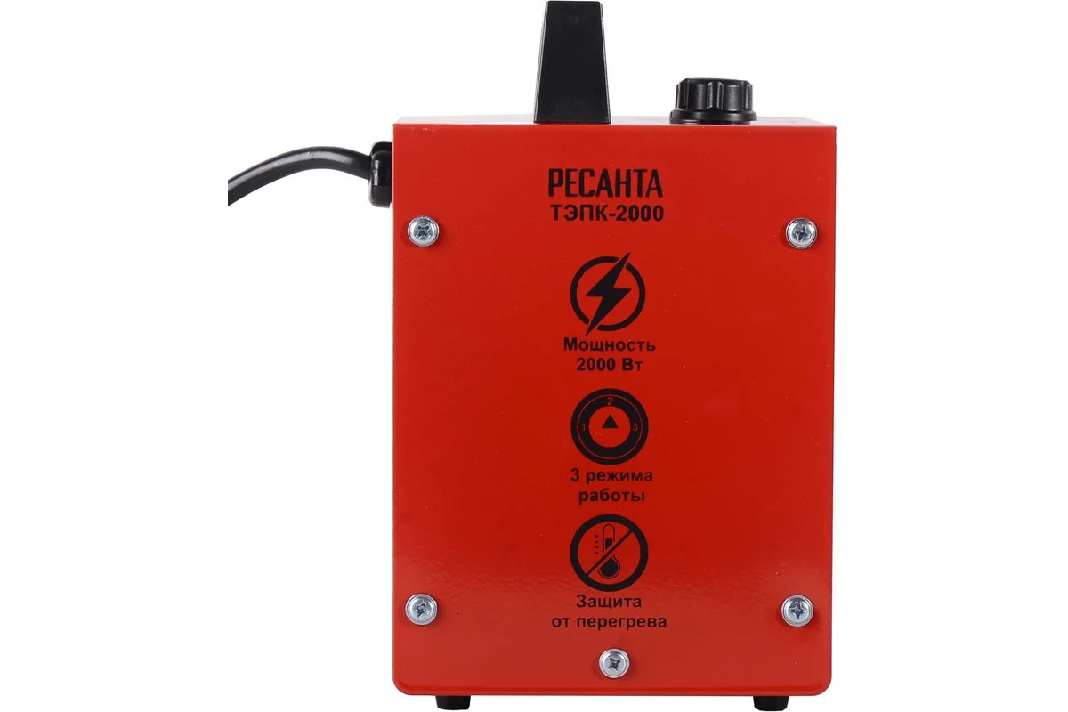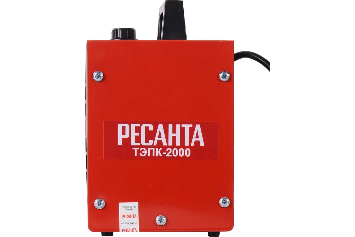Корпус тепловой пушки выполнен из металла и оснащён широкой пластиковой ручкой. Модель Ресанта ТЭПК-2000 имеет квадратную форму, отличается компактными и небольшим весом – 1.73 кг. В основании агрегата имеются прорезиненные ножки, исключающие скольжение устройства на гладких напольных покрытиях. Нагревательный элемент надёжно защищён металлической сеткой, расположенной с фронтальной стороны. В тыльную часть вынесены 5-лопастной вентилятор и блок управления, включающий переключатель режимов работы и регулятор скорости вращения вентилятора. За счёт компактных габаритов электрическая пушка быстро выходит на максимальный режим нагрева и обладает хорошей теплоотдачей. В приборе установлена система термозащиты, которая отключает его в случае перегрева. Работает агрегат от бытовой сети 220 Вт, 50 Гц.