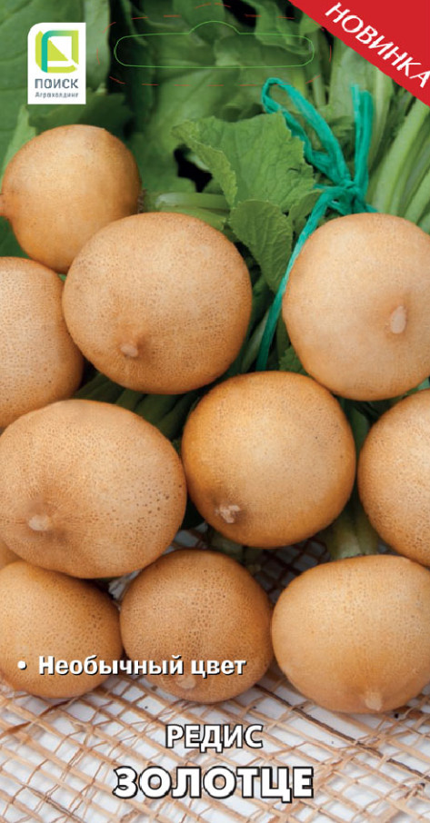 Необычный цвет. Среднеспелый сорт. Период от всходов до сбора корнеплодов 22-28 дней. Корнеплод округлый, желтый, головка выпуклая. Мякоть белая, нежная, сочная. Масса корнеплода 22-25 г. Вкусовые качества хорошие.