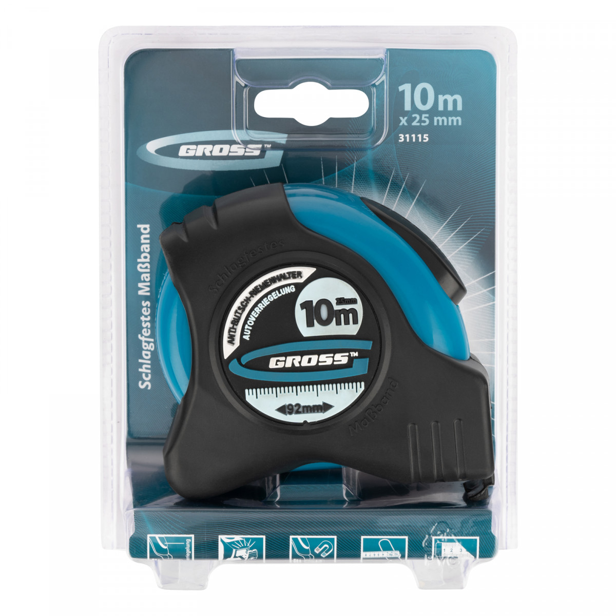 Рулетка Gross «Schlagfest» 31115 с магнитным обрезиненным зацепом, двухсторонней шкалой и функцией автоматической фиксации полотна длиной 10 м и шириной 25 мм, с нейлоновым покрытием, позволяет определять размеры предметов, вычислять площадь помещения и проводить другие измерительные работы. Магнитный обрезиненный зацеп надежно фиксируется на скользких и металлических поверхностях со сложной формой. Широкое упругое полотно облегчает работу в труднодоступных местах. Карманная рулетка пригодится на строительной площадке и в быту.