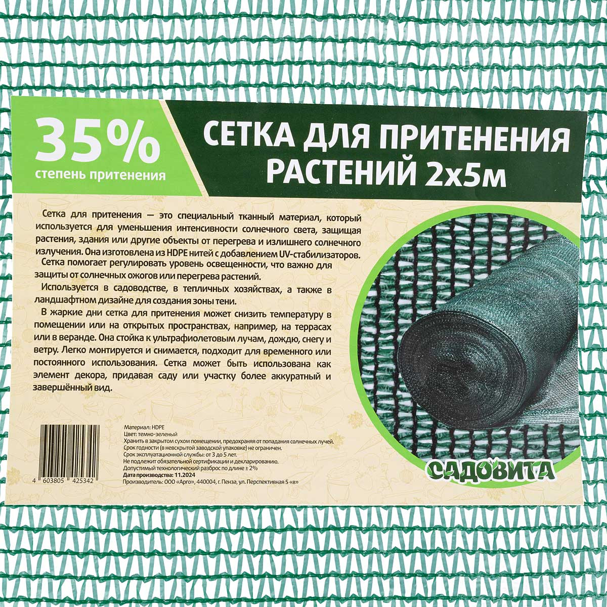 Степень затенения 35%. Плотность материала 35 г/м². Длина 5 м, ширина 2 м.