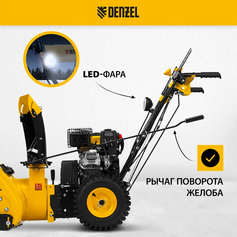 - Срезные болты в комплекте — c каждым двухступенчатым снегоуборщиком Denzel клиент получает 10 запасных срезных болтов на шнек, чтобы обеспечить бесперебойную работу техники