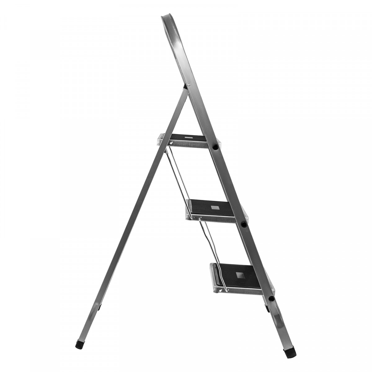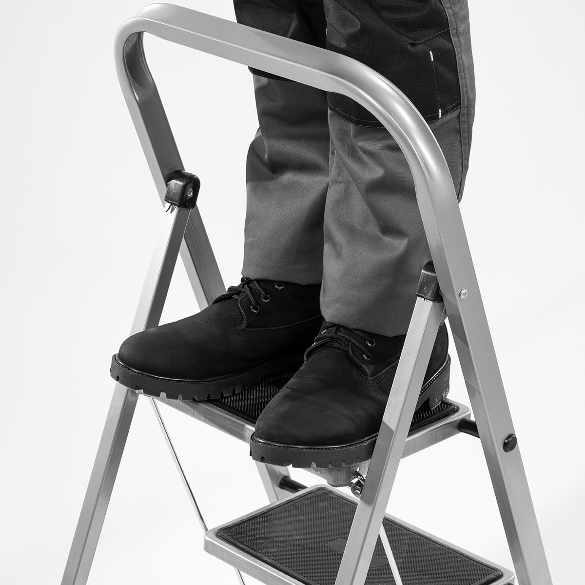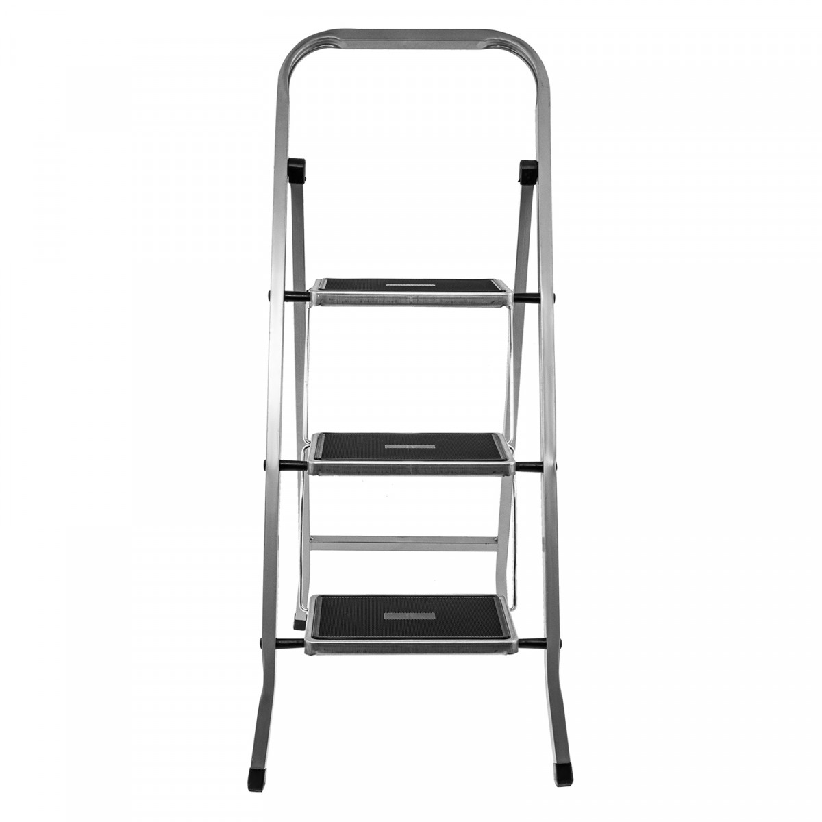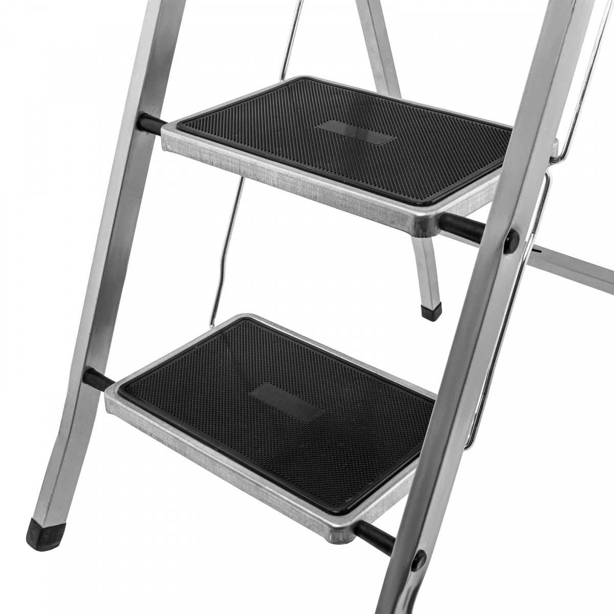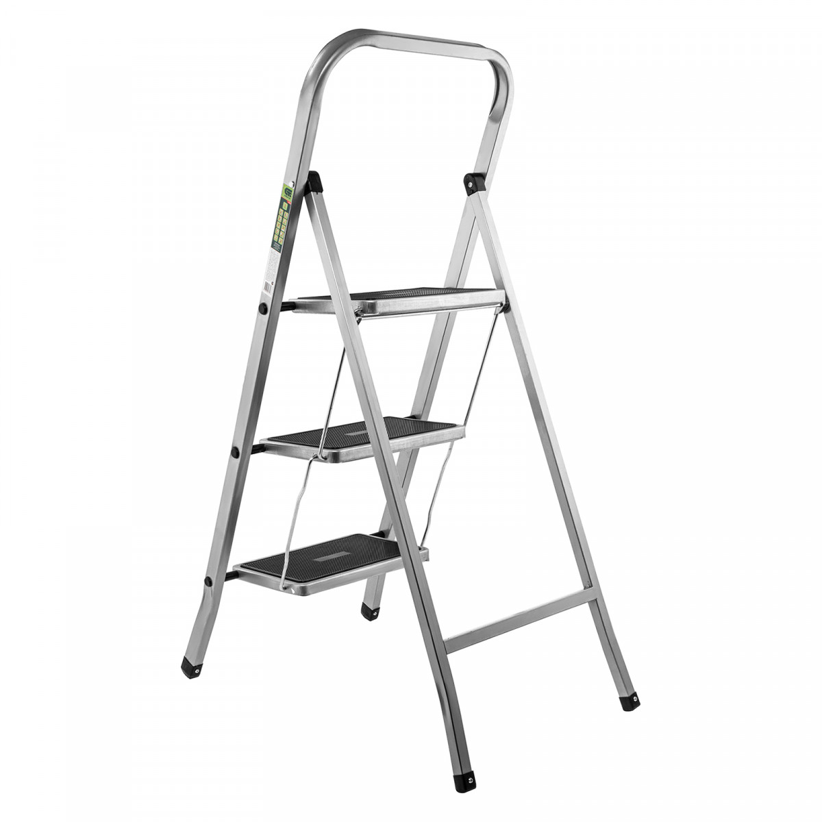 • Прочность — рама и ступени изготовлены из стали, поэтому стремянка выдерживает нагрузку 120 кг.