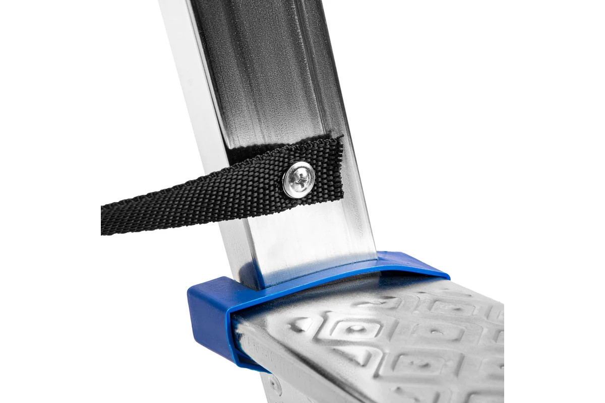 - Надежность — стремянка из стального профиля с широкими ступенями выдерживает вес до 120 кг, страховочные ленты из полиэстера повышают устойчивость