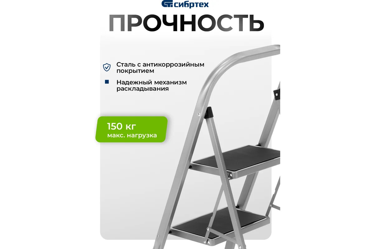 - Прочная конструкция — стремянка изготовлена из стального профиля и снабжена надежным механизмом раскладывания, поэтому выдерживает нагрузку до 150 кг