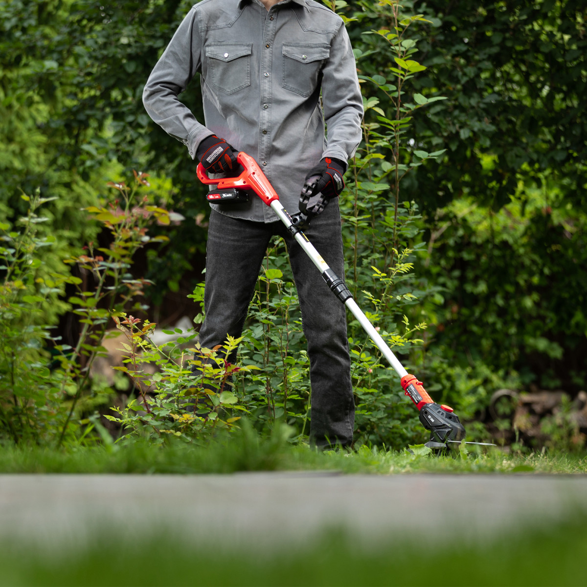 • Полная комплектация — к триммеру прилагается аккумулятор емкостью 2 А·ч с защитой от глубокого разряда и зарядное устройство, которое заряжает АКБ за 1,5 часа.
